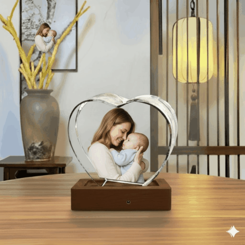 Capture emotion with photo inside heart crystal engravings — glowing 3D symbols of love.