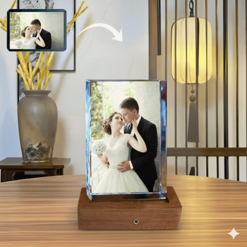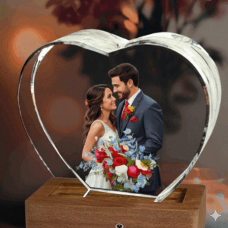 Each crystal turns the couple’s favorite photo into glowing art, preserving every smile and detail with lifelike clarity.