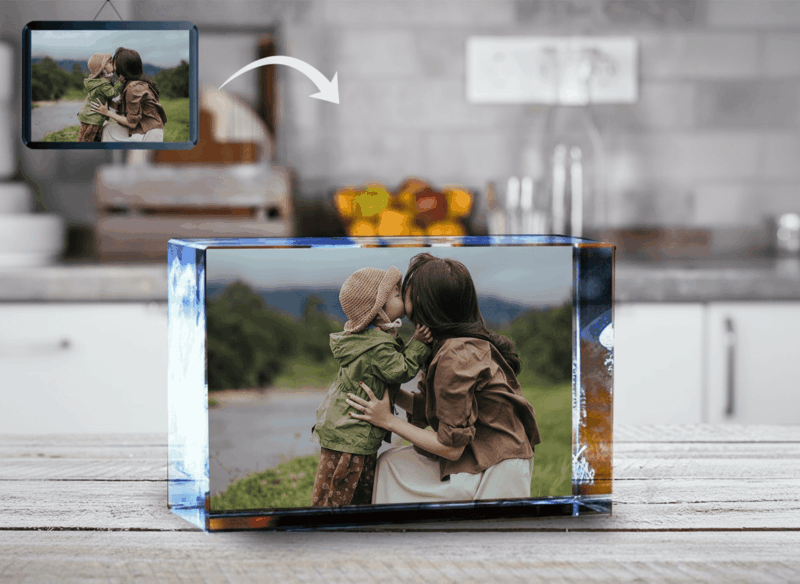 A custom photo crystal transforms your own image into a floating white relief sealed within the crystal block. Because the artwork is internal (not surface-printed), it won’t rub off or fade, and it looks stunning in both daylight and under a light base.